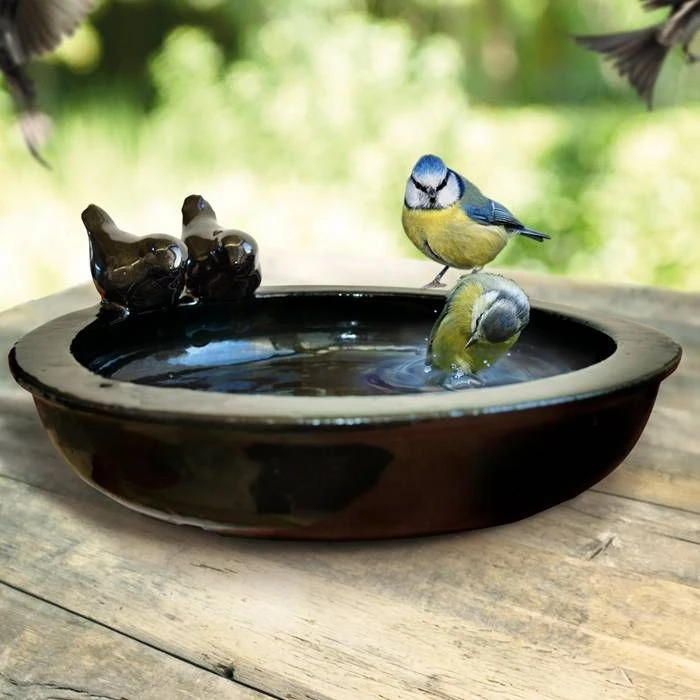 Ce bain noir et rond fait en céramique ravira les oiseaux qui adorent se baigner et boire dans ce genre de recipient.Non seulement utile pour les oiseaux c’est aussi un objet décoratif qui résiste très bien au froid de l’hiver.