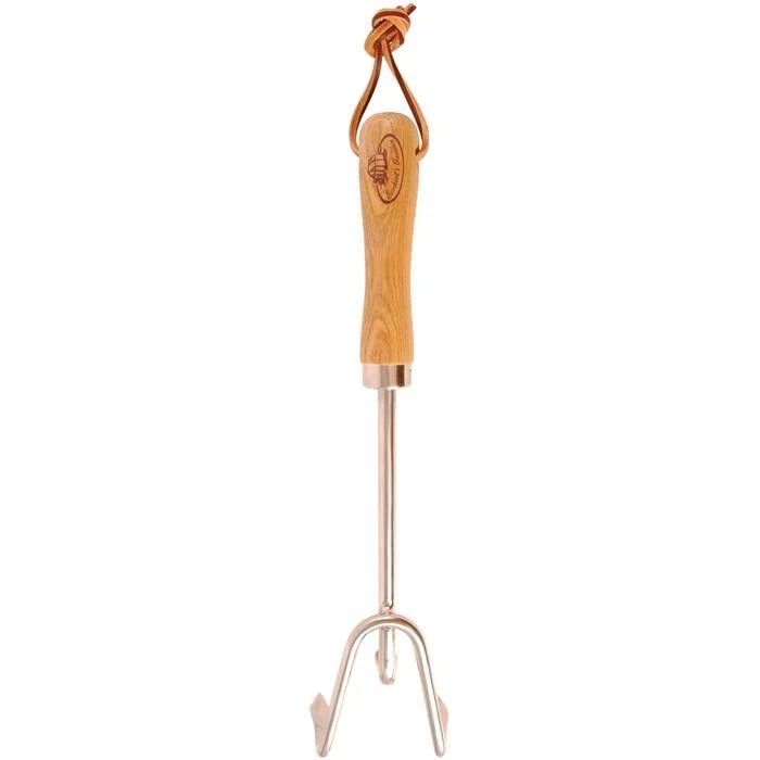 Ce petit rateau inoxydable possède un manche en bois de frêne, une griffe en acier inoxydable et un petit lien de cuir pour mettre autour du poignet.Dimensions: 7,8 x 7,2 x 37 cm